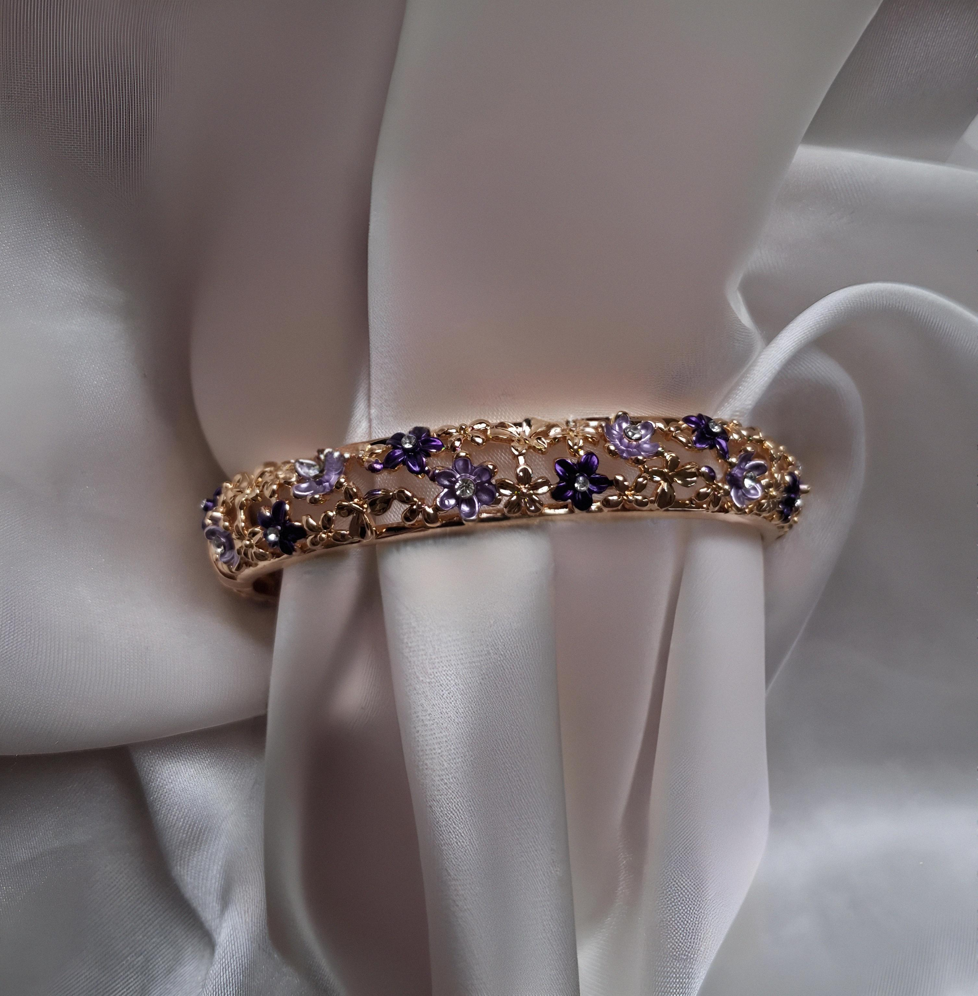 Moonlight Whisper bilezik, gece göğünün gizemli çekiciliğini ve ay ışığının huzur veren rüyasını bileğinize taşıyan, büyülü bir zarafettir. Mor ve lila tonlarındaki minik çiçek desenleri, tıpkı yıldızların altında açan nadide bir bahçe gibi, her anınıza derinlik ve mistik bir dinginlik katar.