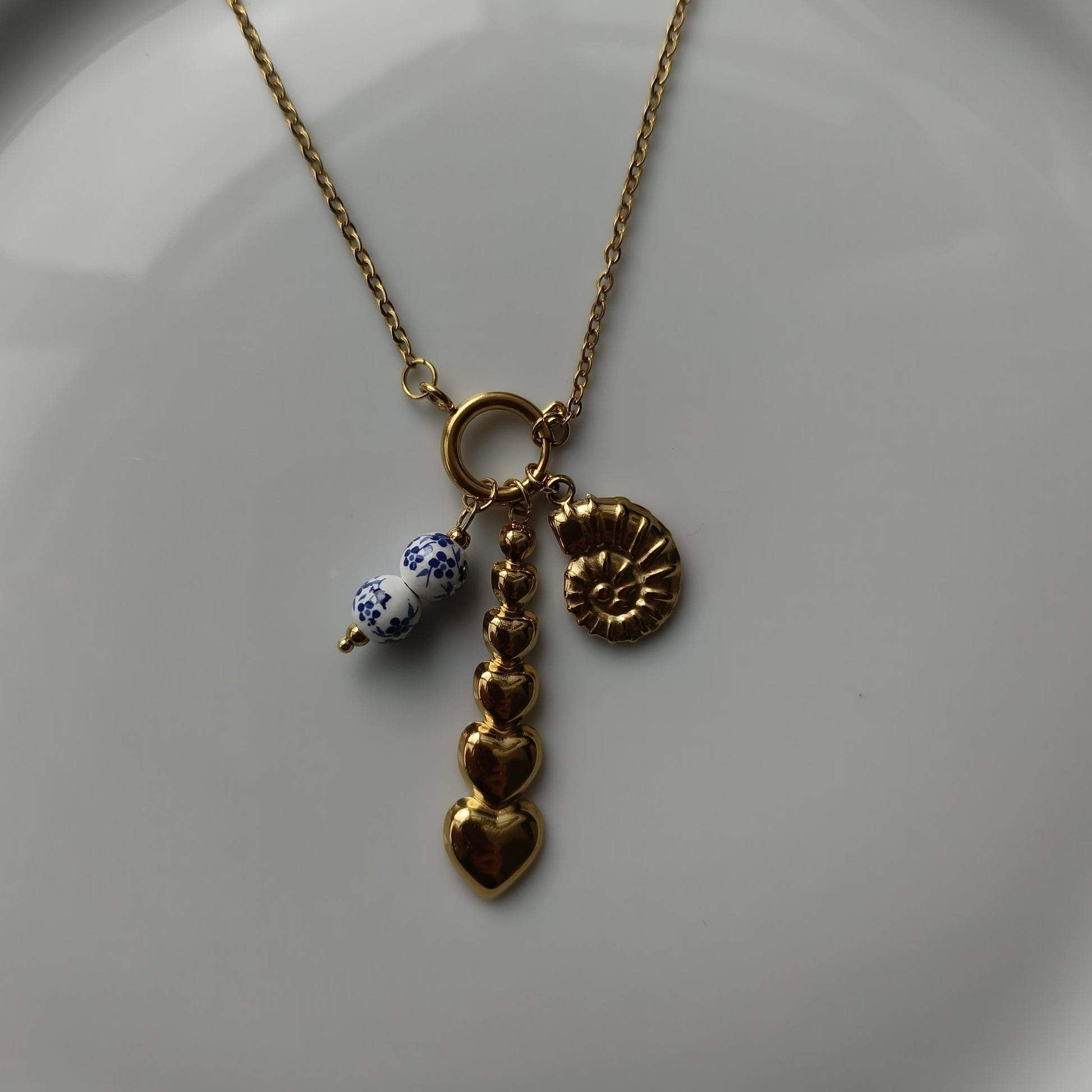 Her charm, yaşamın farklı deneyimlerini ve toplanan değerli anıları temsil eder. Porselen boncuklar kırılganlığı ve güzelliği, altın kalplar sevgiyi, deniz kabuğu ise doğayla bağlantıyı simgeler. Bu kolye, taşıyanına hayatın her anından bir şeyler toplayıp biriktirme ve geçmişin güzel anılarını koruma becerisini hatırlatır.