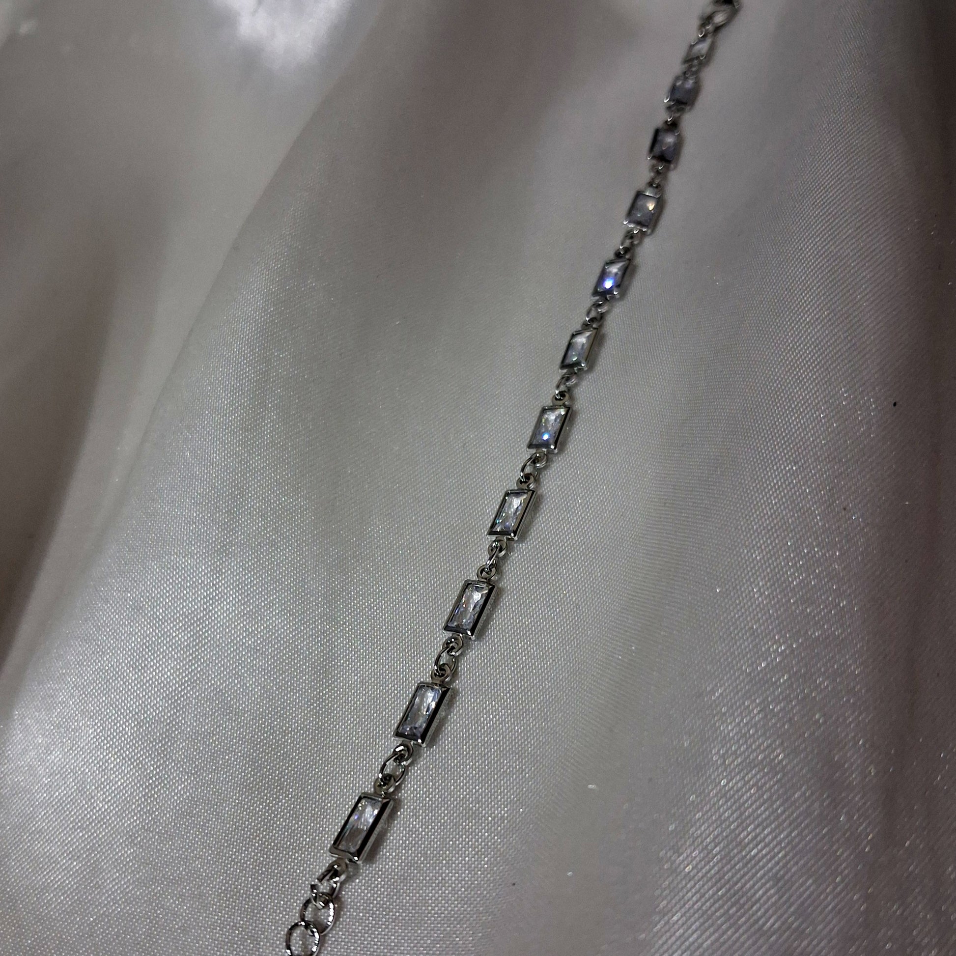 İnce ve narin gümüş tonlu zincir üzerinde, pürüzsüz baget (dikdörtgen) kesimli kristal taşlar zarif aralıklarla dizilmiştir. Her bir taş, geometrik formu sayesinde ışığı düzgün bir çizgi halinde yansıtarak, bileğinizde keskin ve temiz bir ışıltı akışı yaratır. Bu aralıklı dizilim, bilekliğin narinliğini ve hafifliğini ön plana çıkarır. Linear Grace, abartıdan uzak, çağdaş bir şıklık arayanlar için mükemmel bir seçimdir.