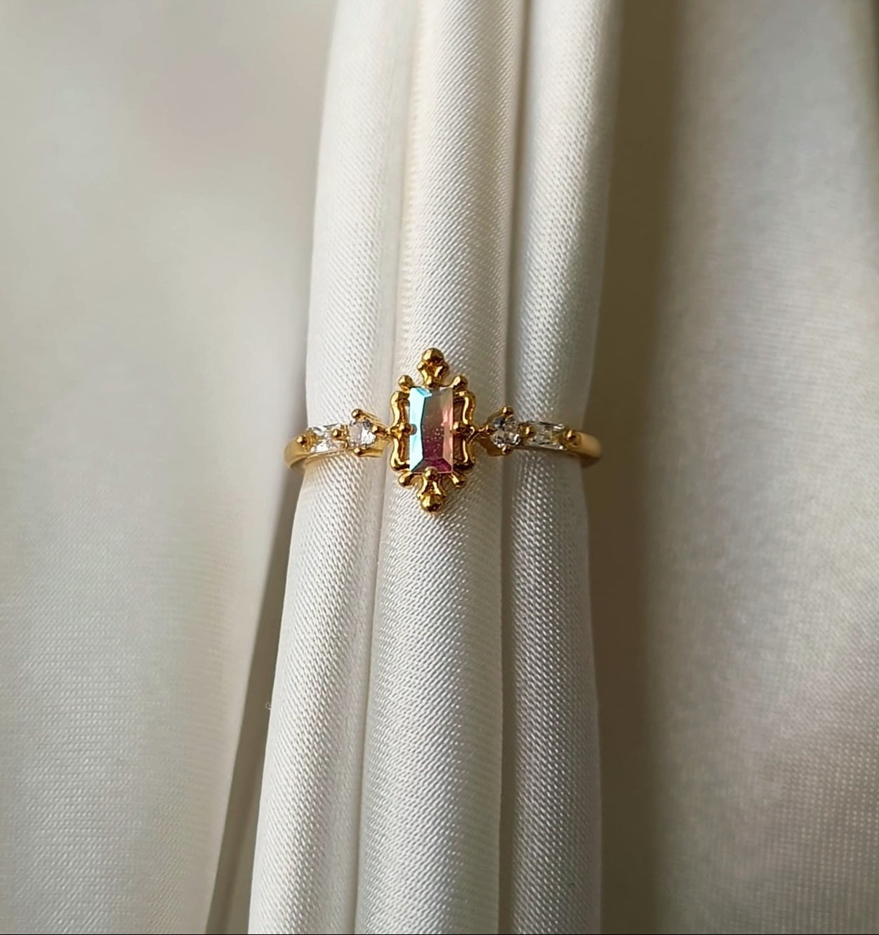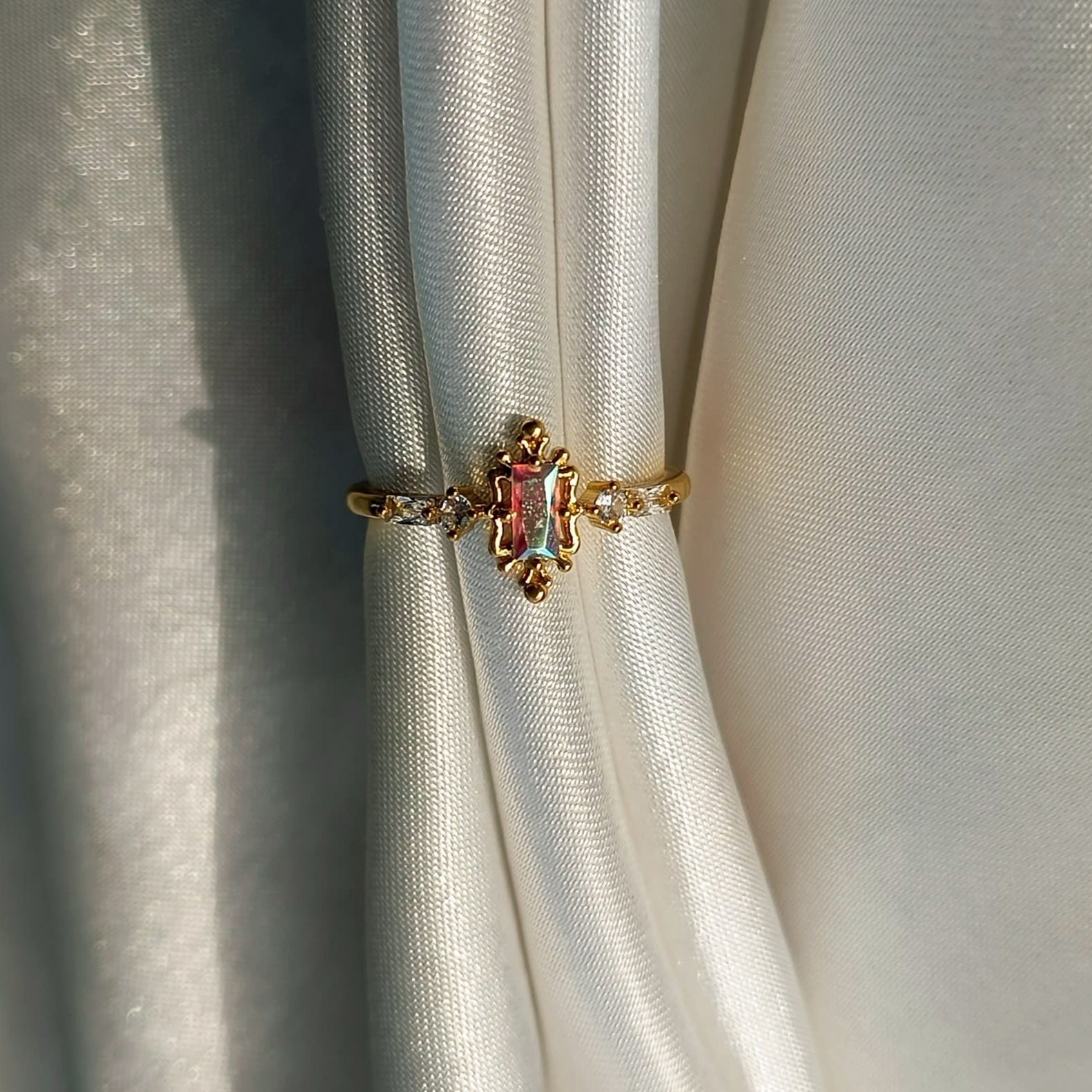 Mystic Dawn yüzük, gökkuşağı renklerinin altının sıcak parıltısı içinde uyanışa geçtiği enerji dolu bir şaheser. Merkezdeki çok renkli taş, sanki şafağın ilk ışıklarını yakalamış gibi canlı tonlarda ışıldıyor. Altın bantaki kristal detaylar, güneş ışınlarının kırılması gibi enerji saçarken, merkez taşın rengarenk parıltısı yeni başlangıçların umudunu yansıtıyor. Bu dinamik tasarım, sabahın taze enerjisini parmakta taşıyan ilham verici bir parça.
