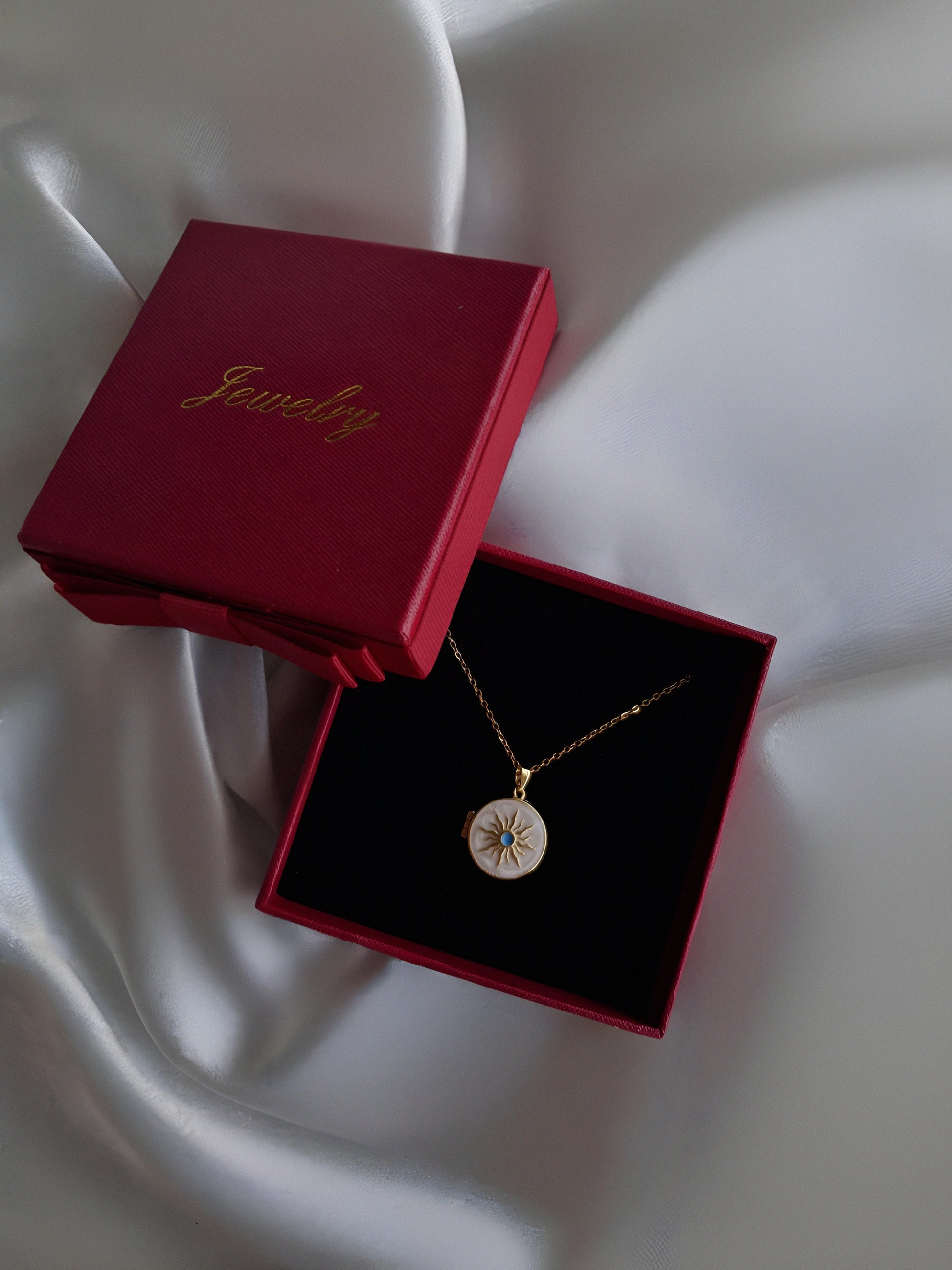 Sunny Treasure madalyon kolye, güneşin sıcaklığını kalbinizin en değerli hazineleriyle birleştiren özel bir parça. Beyaz zemin üzerindeki altın güneş motifi, yaşamınızın en aydınlık anlarını ve kıymetli hatıralarınızı simgeliyor. Açılabilir tasarımıyla içinde sakladığınız fotoğraf veya anı, gerçek bir hazine gibi korunuyor. Her açtığınızda sizi güneş ışığı kadar ısıtan bu eşsiz madalyon, sevginin ve anıların zamansız gücünü yanınızda taşımanızı sağlıyor.