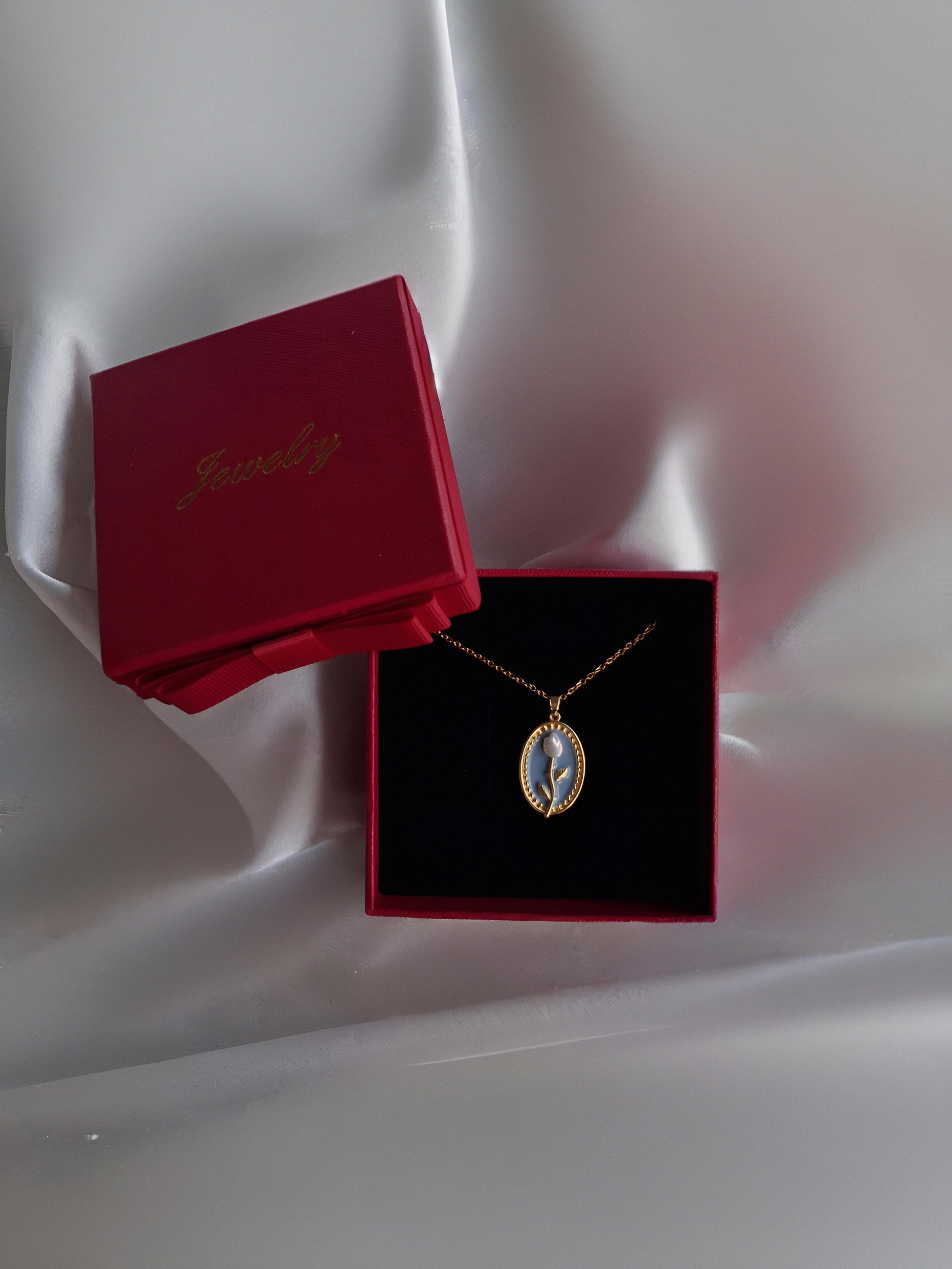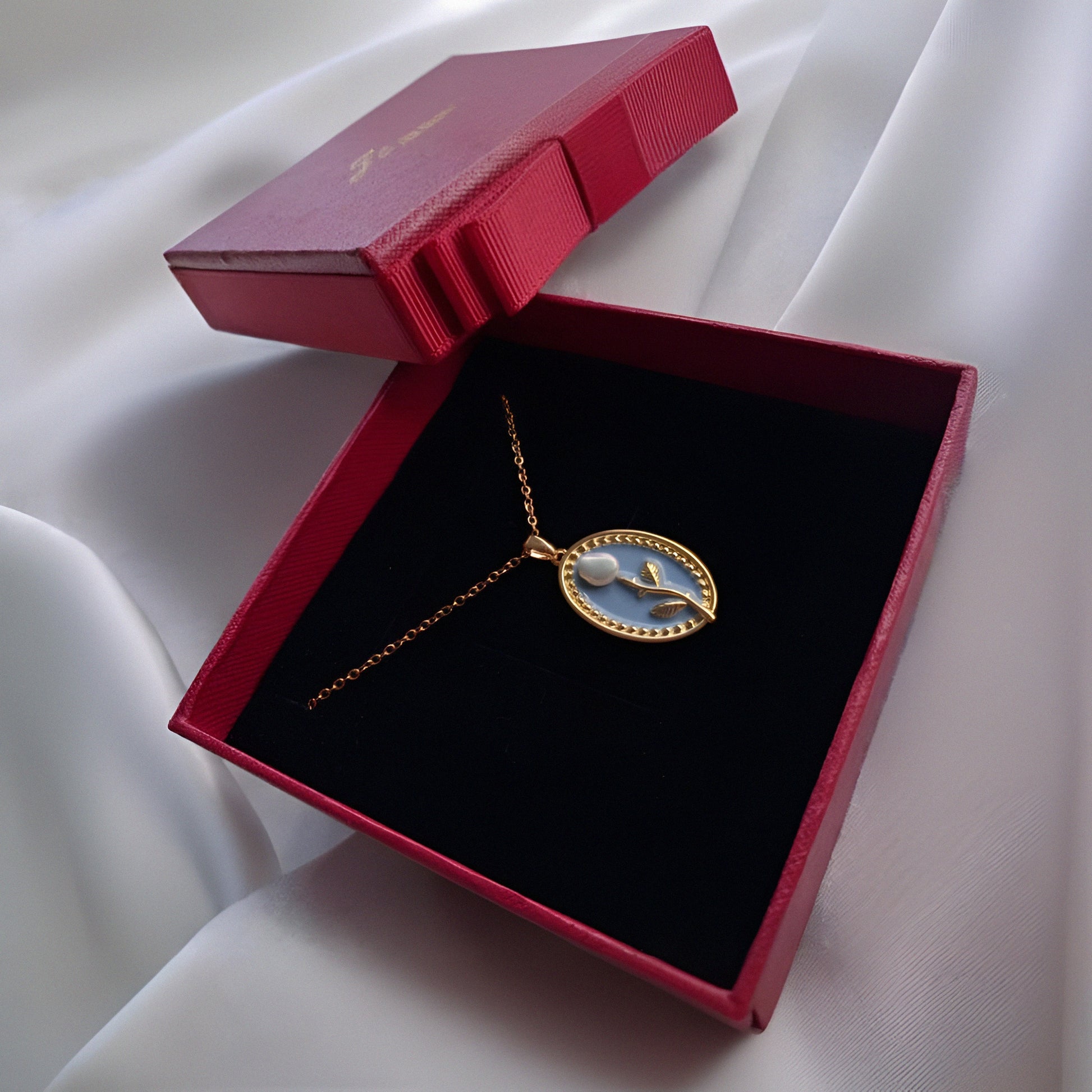 Rose Prism kolye, kristal berraklığı içinde ebedi gül motifinin zarafetini barındıran romantik bir şaheser. Oval formundaki şeffaf kristal, içinde işlenmiş gül siluetiyle sanki zamanda donmuş bir aşk hikayesi gibi duruyor. Altın çerçevesinin sıcaklığı, kristal soğukluğuyla mükemmel kontrast yaratarak, tutku ile saflığın eşsiz birlikteliğini sergiliyor. Her ışık altında farklı derinliklerde görünen gül motifi, sonsuz aşkın zamansız güzelliğini yansıtıyor.