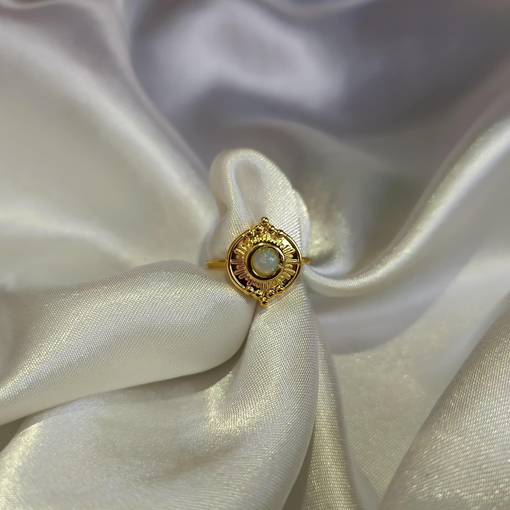 Pusula formu, hayatta doğru yön bulma ve kendi iç sesini dinleme becerisini temsil eder. Opal taşın değişken renkleri, kişiliğin çok boyutlu doğasını simgelerken, altın ışınlar hedefe ulaşmak için gereken kararlılığı anlatır. Bu yüzük, taşıyanına hayatın karmaşasında bile doğru yolu bulma ve kendi değerlerine sadık kalma gücü verir.
