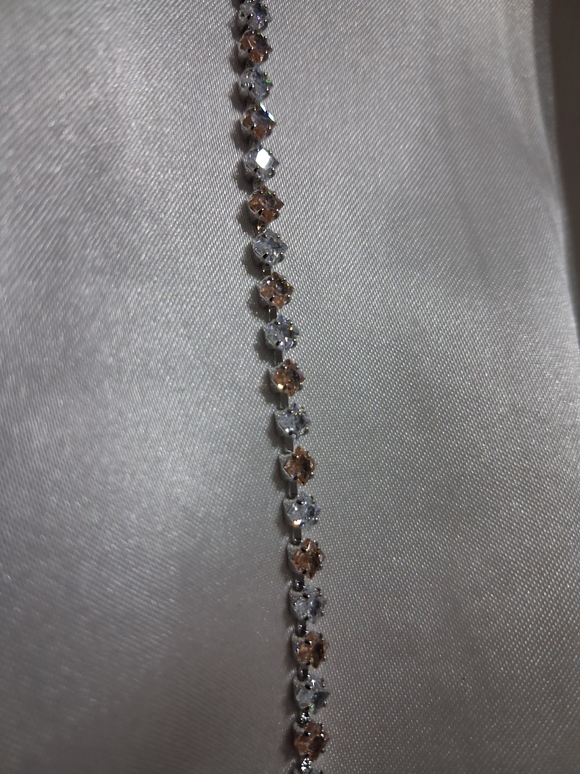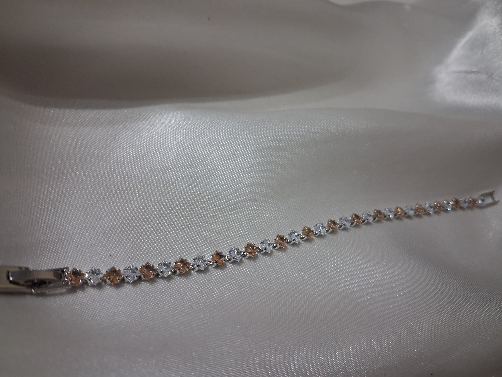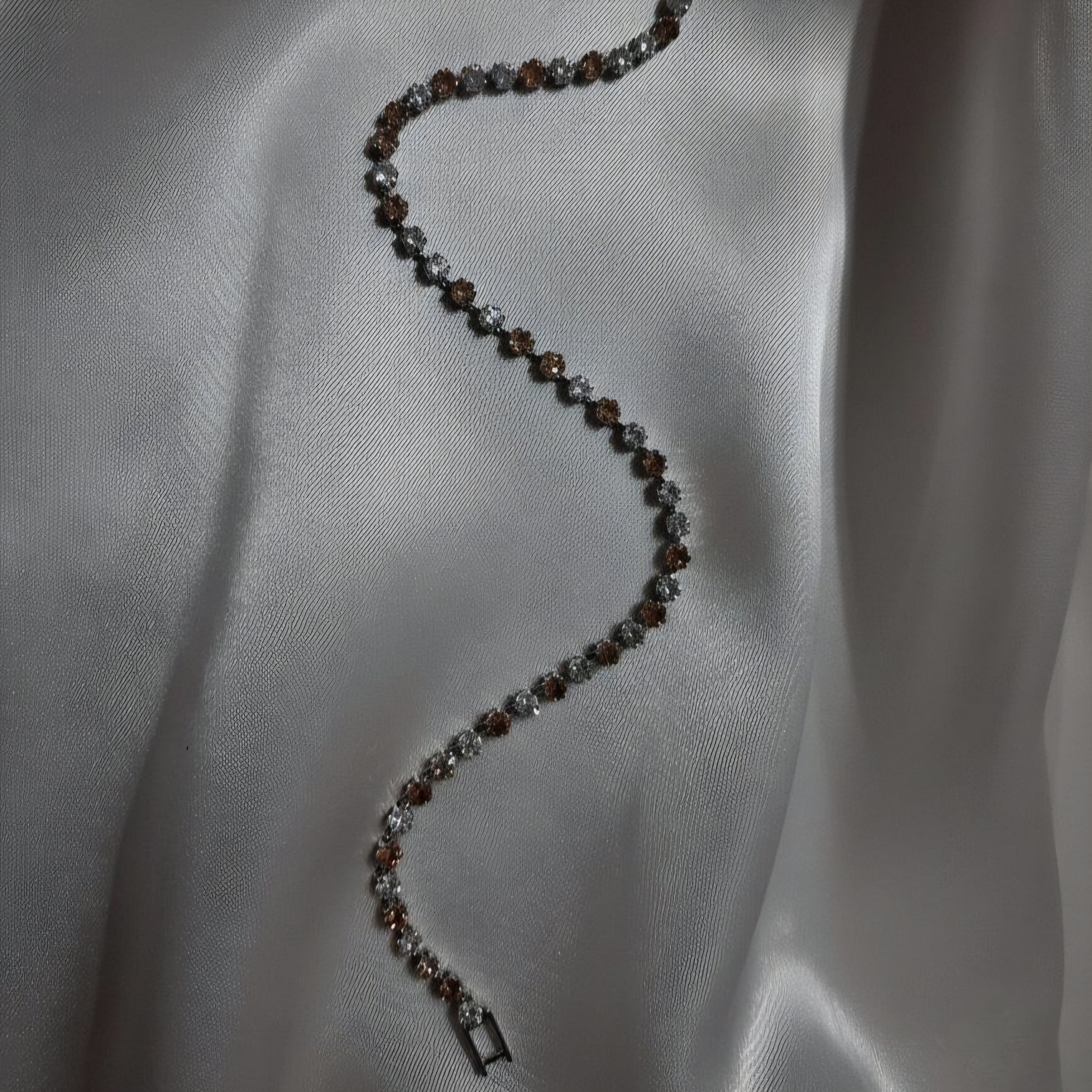 İnce ve zarif gümüş tonlu bir bant üzerinde, şeftali-kahve tonlu ve berrak taşlar, kusursuz bir denge içinde sırayla dizilmiştir. Bu ritmik akış, tıpkı gün batımının altın rengi ile ay ışığının parlaklığının buluşması gibidir. Bilekliğin sıcak tonları size huzur ve güven verirken, yansıttığı ışıltı her anınıza göz alıcı bir parlaklık katar. Topaz Glow, doğallığı ve sofistike bir şıklığı aynı anda arayanlar için zamansız bir imzadır.