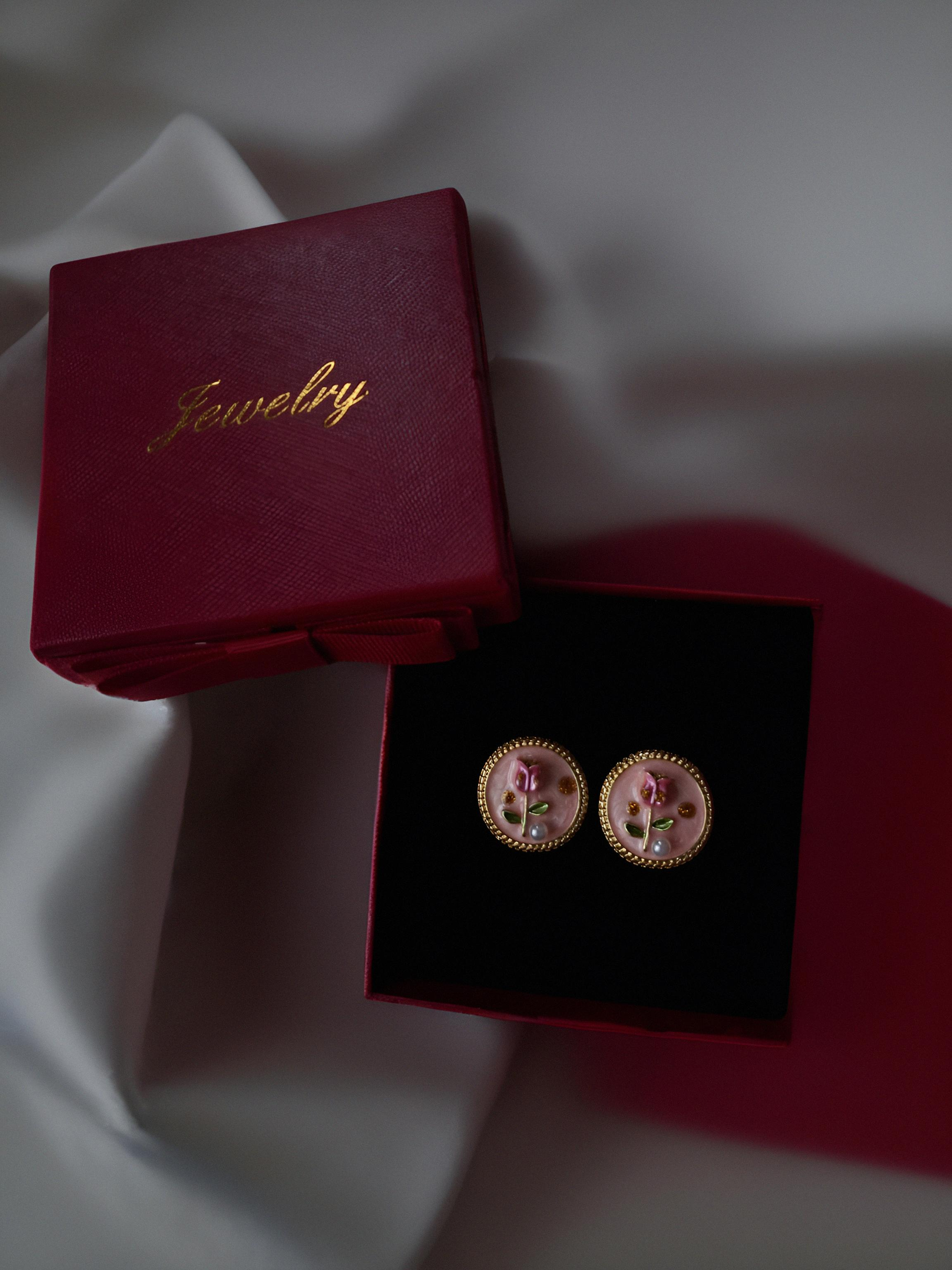 Garden Dreams Pink küpeler, pembe romantik zemin üzerinde çiçeklerin ve incilerin zarif dansını sergileyen büyüleyici bir şaheser. Her küpe, allık pembe fon üzerinde gül motiflerinin ve inci detaylarının mükemmel uyumunu sergileyen şirin bir bahçe köşesi gibi duruyor. Altın çerçevenin sıcak parıltısı, bu çiçekli kompozisyonu değerli bir mücevher haline getirirken, pembe tonların yumuşaklığı romantik bir atmosfer yaratıyor. Kulağa asıldığında sanki bahar sabahının tatlı esintisini getiriyor.