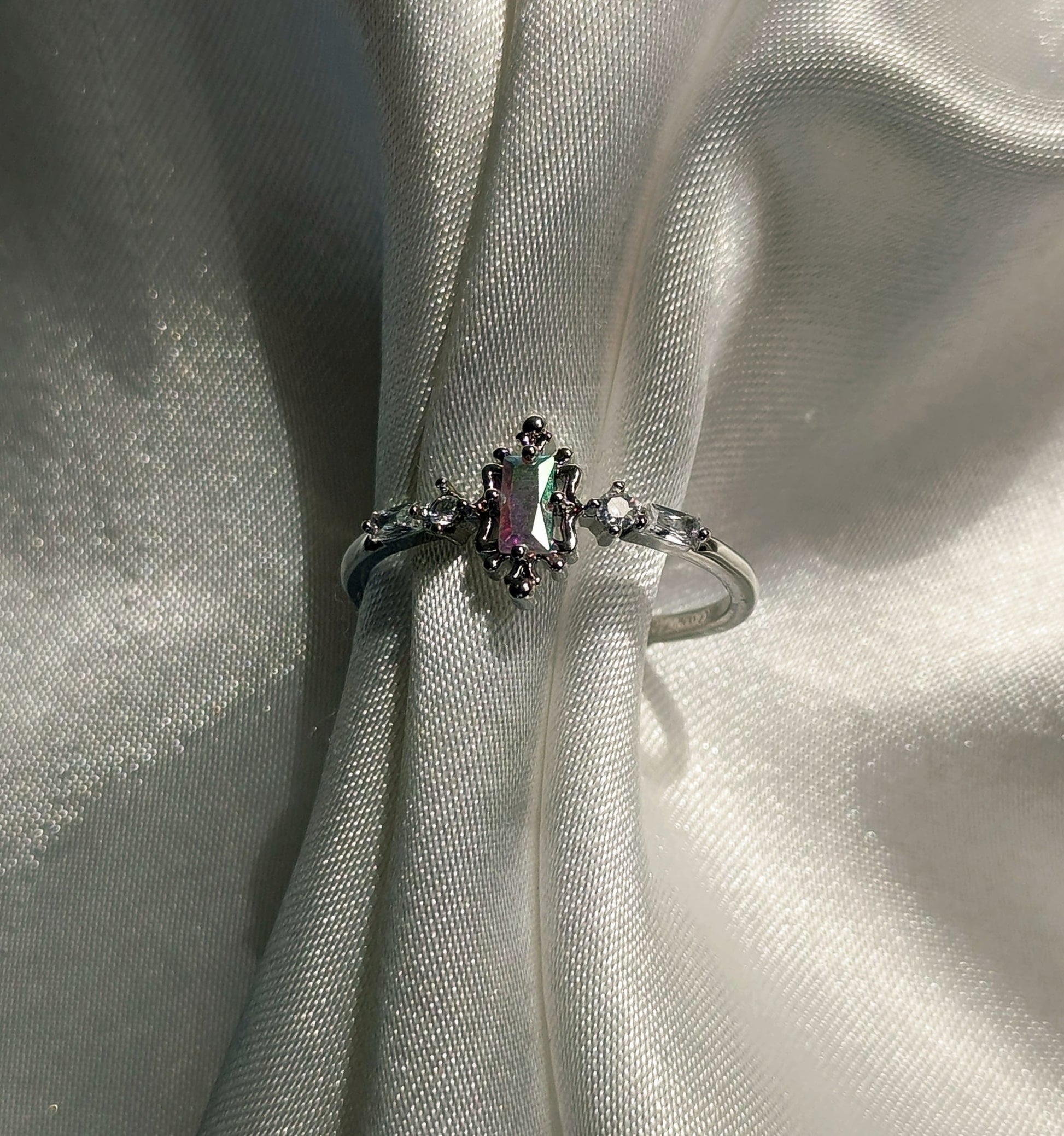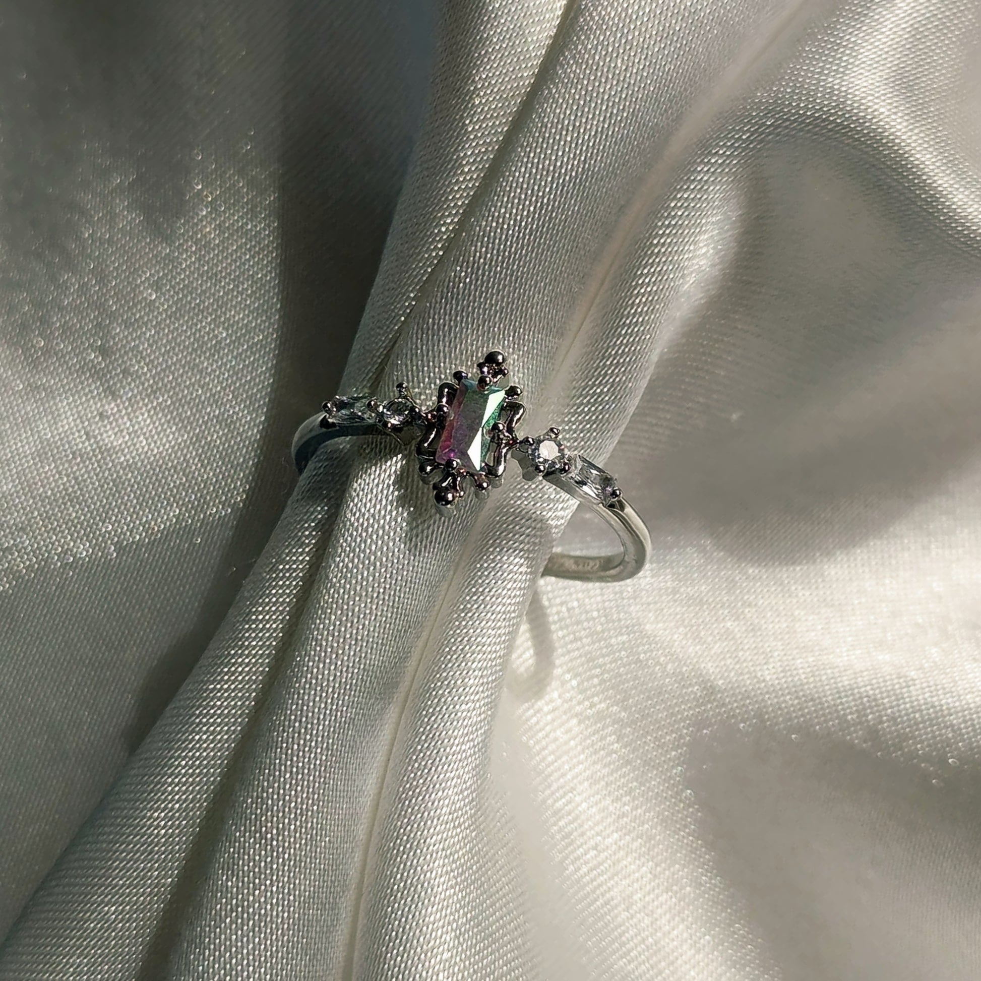 Mystic Twilight yüzük, gökkuşağı renklerinin gümüşün soğuk zarafeti içinde dans ettiği büyüleyici bir şaheser. Merkezdeki çok renkli taş, sanki alacakaranlığın son ışıklarını yakalamış gibi mor, yeşil ve pembe tonlarda parıldıyor. Gümüş banttaki kristal detaylar, ay ışığının kırılması gibi çevreye yansırken, her açıdan farklı renk tonları sergileyen merkez taş mistik bir atmosfer yaratıyor. Bu zarif tasarım, gecenin sessiz büyüsünü parmakta taşıyan eşsiz bir parça.