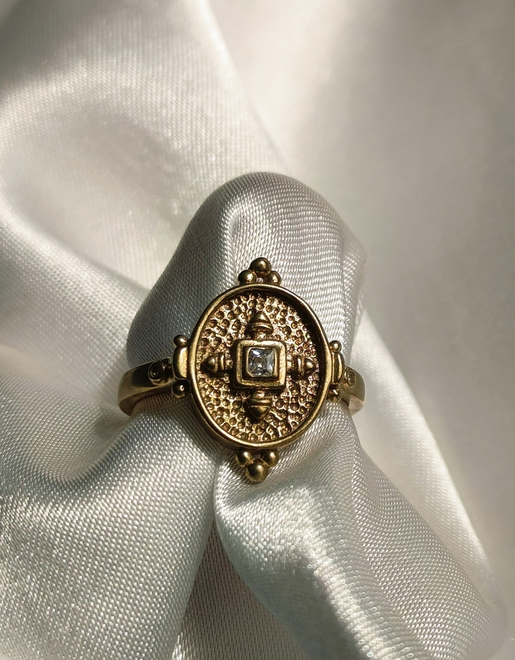 Antik taç, liderlik ve bilgeliği temsil ederek kişinin doğal otoritesini simgeler. Karmaşık desenlerin bütünlüğü, yaşamın farklı yönlerini harmoni içinde yönetme becerisini anlatır. Bu yüzük, taşıyanına kendi değerini bilme ve her durumda asil duruş sergileme gücü verir, geçmişin deneyimlerinden aldığı güçle geleceğe yürüme becerisini hatırlatır.