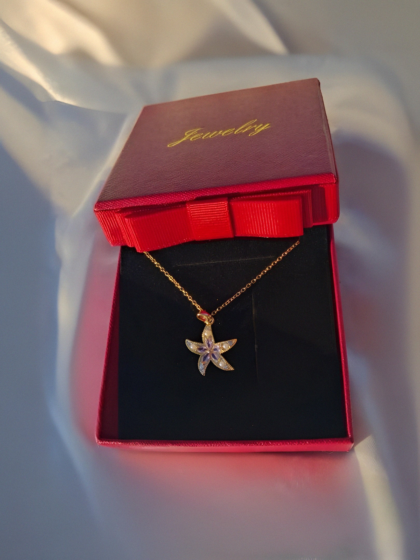 Solar Starfish kolye, deniz yıldızının büyülü formunu güneşin altın enerjisiyle buluşturan canlı bir parça. Deniz yıldızı şeklindeki şeffaf taş, altın çerçevesiyle sarılarak gündüz okyanuslarının parıltısını yansıtıyor. Güneş enerjisinin yaşam verici gücü ve deniz yıldızının yenilenme özelliği birleşerek dinamik bir aura sunuyor. Her bakışta sizi güneşli sahillere götüren bu eşsiz kolye, günlük kombinlerinizde güneşin sıcaklığını taşıyacak.