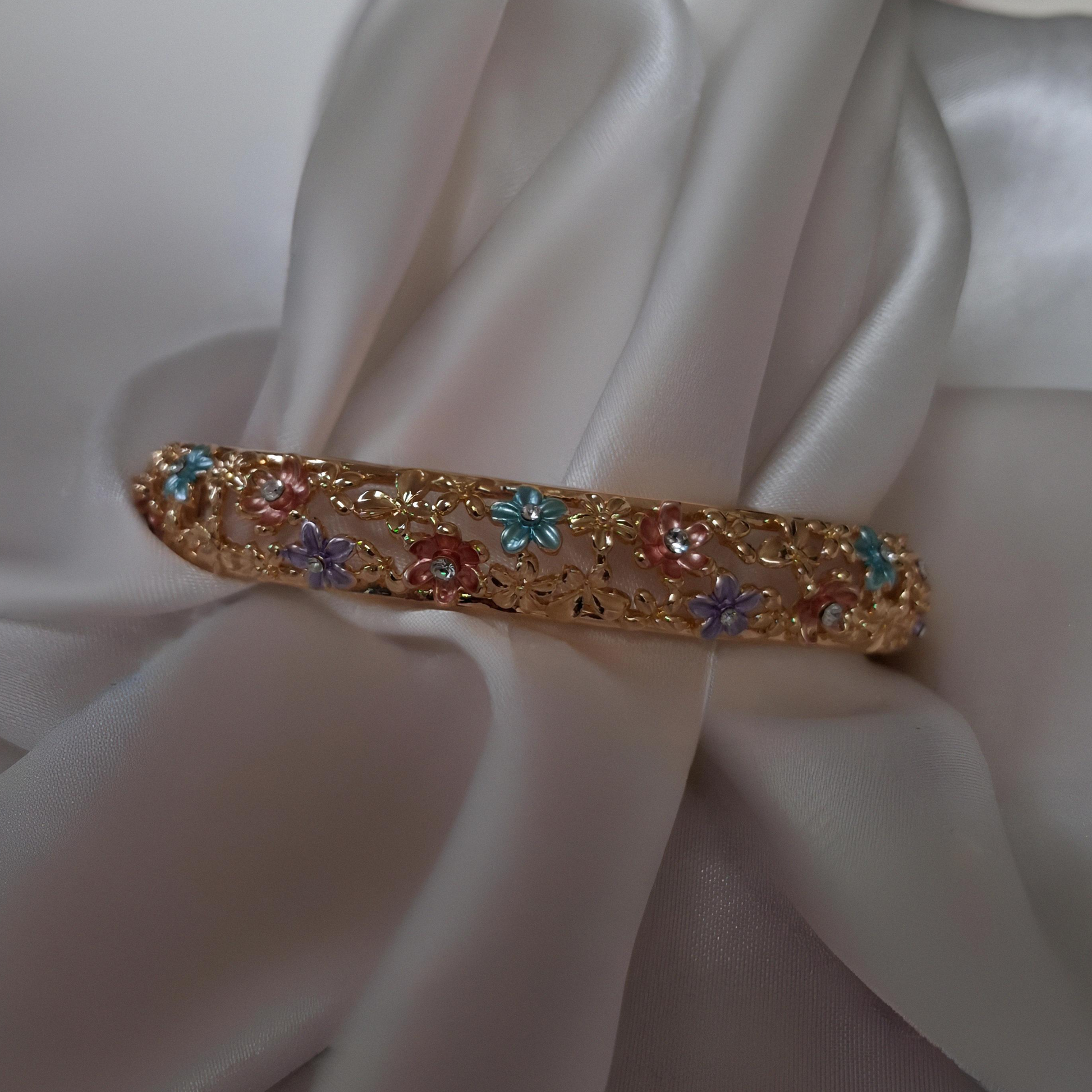 Spring Whisper bilezik, en tatlı anıların ve yeniden doğuşun narin coşkusunu bileğinize taşıyan, adeta bir bahar bahçesi fısıltısıdır. Pastel tonlardaki minik çiçek desenleri, tıpkı kış uykusundan uyanan doğa gibi, her anınızı neşe ve umutla doldurur. Altın tonundaki zarif kafes işçiliği, bu çiçekli ritmin sürekliliğini ve bileziğin zamansız değerini simgelerken; merkezlerindeki ışıltılı taşlar ise, kalbinizin saf ve yenilenen enerjisini temsil eder.