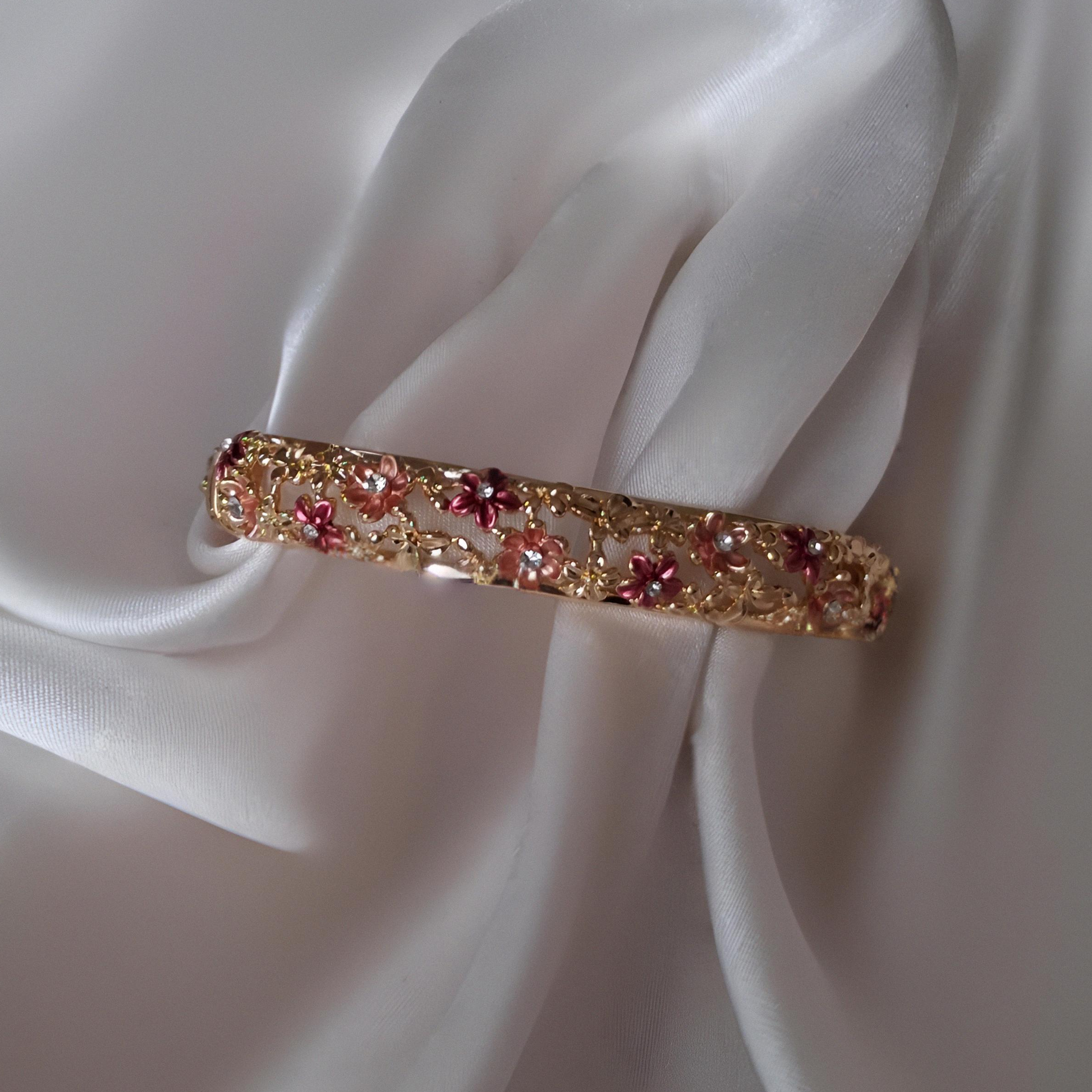 ❤️ Koyu Pembe ve Gül Kurusu çiçek desenleri ✨ Pırlanta görünümlü merkez taşlar 🌟 Sıcak Altın Tonu kaplama 💖 Tutkulu ve Romantik bir şıklık
