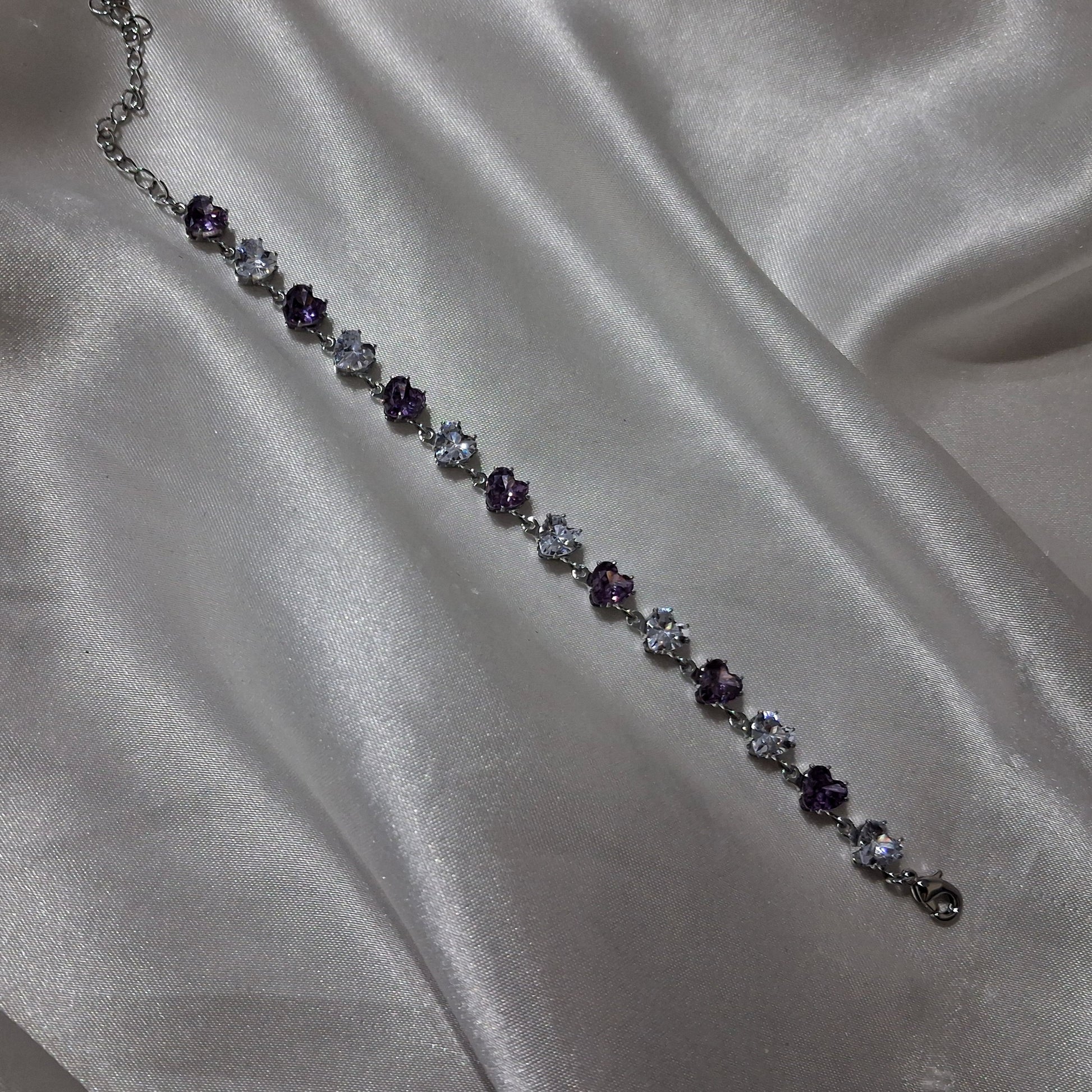 Violet Sparkle bileklik, kalp kesim taşların sonsuz ışıltısını ve morun asil tonunu, gümüş tonlu zarif bir bant üzerinde buluşturan, kalbin zarafetini bileğinize taşıyan özel bir mücevherdir.